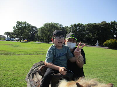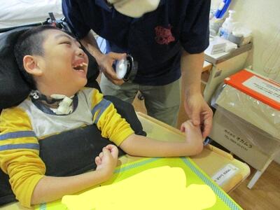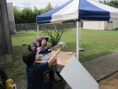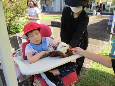 9月20日は熊本県こども総合療育センターの行事で、熊本県肢体不自由児協会主催の「移動ふれあい動物園」が行われました。心配された台風の影響もなく、快晴の中、実施できました。