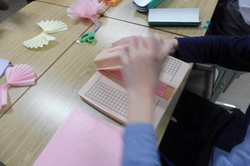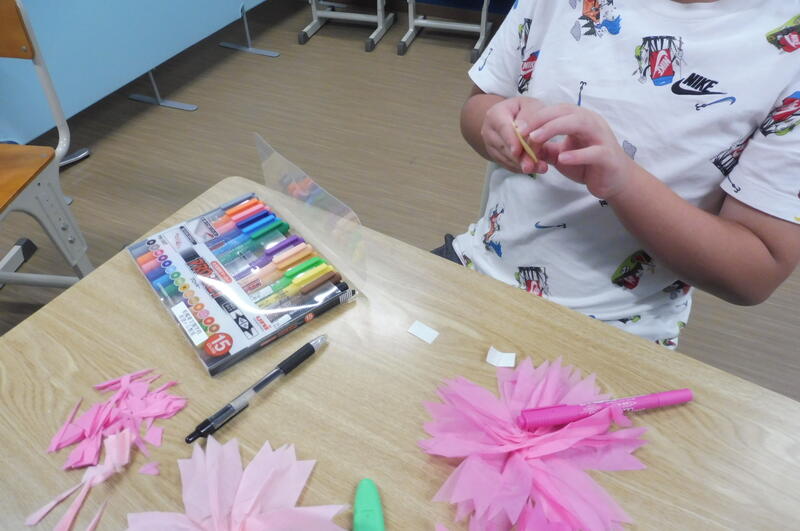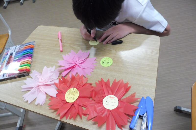 本校では10月21日に創立50周年記念式典が行われます。希望教室では、式典で使用する花作りを行いました。小学部は学校の壁面に飾るコスモスを作りました。色やイラストなどを工夫し、個性豊かなコスモスができあがりました。中学部は式典の2部で使用する花を作りました。得意な作業、やりたい作業毎に役割分担し、和気あいあいとしながらもてきぱきと集中して取り組んでいました。これから仕上げを行い、できあがった完成品を本校に届けます。
