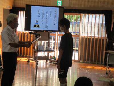 希望教室で1学期の終業式を行いました。教頭先生のお話で、1学期に希望教室で取り組んだ「松東レクリエーション」の飾り作りや、「創立50周年記念式典」の壁画制作の様子などを振り返りました。その後、先日行われたフォトコンテストで投票が多かった2人の作品を「希望賞」として表彰を行いました。また、参加した8人の子どもたちにも参加賞として賞状を授与しました。