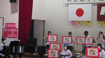 これまで全校集会時、創立50周年記念式典に向けて、松東ハッピーズの皆さんが50周年記念ソングの披露や演奏などを行ってきました。10月の全校集会が創立50周年記念式典前の最後の全校集会でしたので、松東ハッピーズの皆さんは今回で解散となりました。これまでみんなをたくさん盛り上げてくれました!