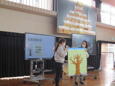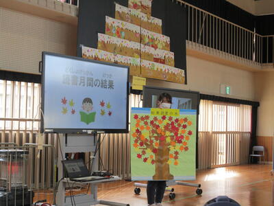 読書月間の目標は「みんなで、80冊本を読もう!」です。本を借りた際は「松東読書の木」にもみじの葉を貼り付けていきます。