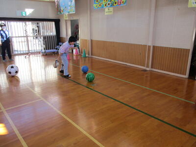 体育では、目標のボールめがけてボールを投げて、目標のボールを動かしてゴールに入れる活動を行いました。
