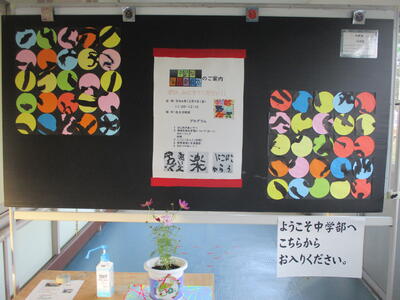 校内では色々な装飾も掲示しています。フラワーアートで制作した花は、玄関に展示しています。