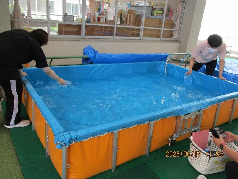 先日、プール活動に向けて、職員皆でプールを設置しました。