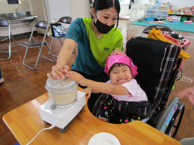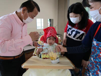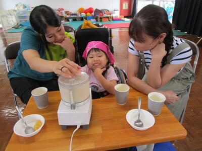 幼稚部の子どもたちは、家族と一緒に「桃シェイクづくり」を楽しみました。