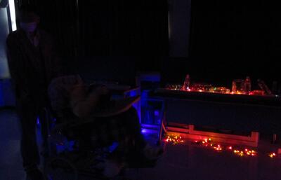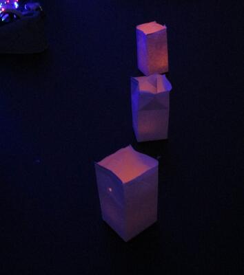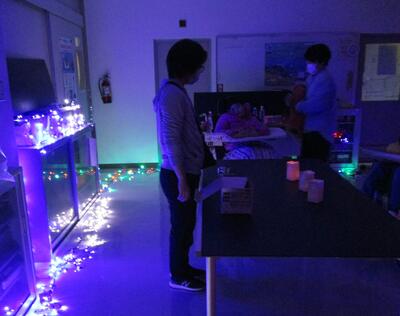 理科室の暗幕を引いて、イルミネーションを体感しました。イメージはディズニーランドのエレクトリカルパレード・ドリームライツ。並べた水入りのペットボトルをとおした優しい光に包まれました。このあと、他の学部の子どもたちも招待して楽しんでもらう予定です。一足早くクリスマスがやってきたようですね。