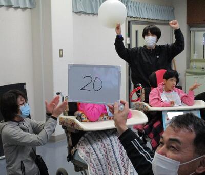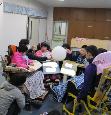 今回は、松橋支援学校オリジナルのスマイルダンスを一緒に楽しんだあと、風船バトミントンや風船バレーで回数を競う学校対抗戦を実施。その後、質問コーナーで質問に答えたり、修学旅行の事を知らせたり、ギター生ライブをしたり・・・「頑張れ~」「すごいね!」「いいなぁ~」などの感想のやりとりもあり、充実した交流学習となりました。