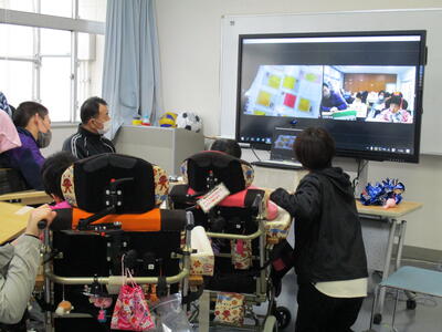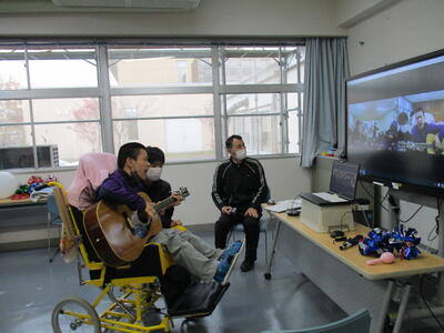 今年10月まで本校中学部で一緒に勉強をした友達のクラスを結んでのオンライン交流。松東支からは「学習発表会」や「職場体験」などを、八支からは、「マラソン大会」や「普段の授業の様子」などについて、伝え合いました。「パプリカ♬」はどちらの生徒も好きな事が分かり、本校生徒のギター演奏に合わせて一緒に歌ったりもしました。