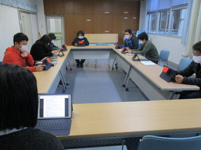 公開授業研究会(令和4年1月28日)は、オンライン実施の予定。今日は、本校ICT支援員の中武さんにも御協力いただき、本会場及び分科会会場をオンラインで結んでの、画像や音声、動画、資料共有の動作確認を行いました。質疑応答における助言者の発言の際に、スムーズに画面が切り替えられるよう、準備するiPadを増やすなど、改善点も確認できました。