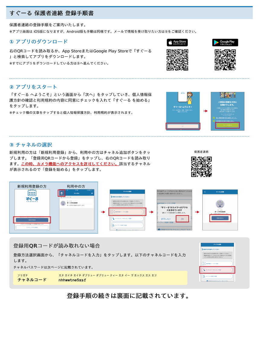 学校・保護者の連絡システム「すぐーる」登録手順書 PDFsuguru.pdf 「すぐーる」は、学校から配信したメッセージを受け取る専用アプリ・メールです。 欠席・遅刻等の連絡は「すぐーる」からお願いします。