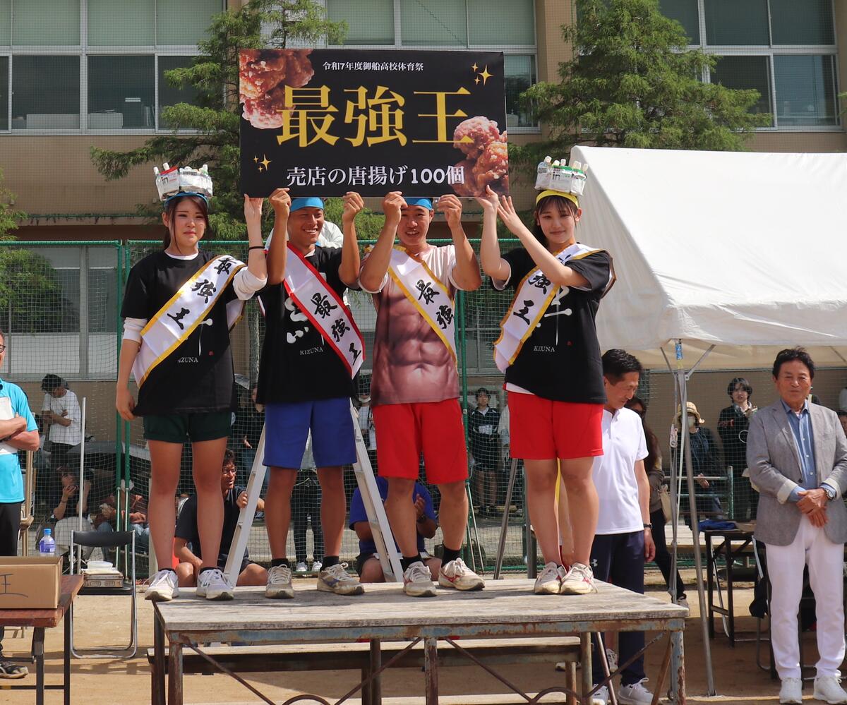 また、今年初めて生徒会企画として「最強王決定戦」を開催しました。運動の得意・不得意にかかわらず、すべての生徒の中から、「笑顔」「奮闘」「楽しんでいた」といった観点で校長賞や会長賞の受賞者を選出しました。副賞として、Tシャツや売店「ういずっとさん」のから揚げ合計48パックが贈られました。
