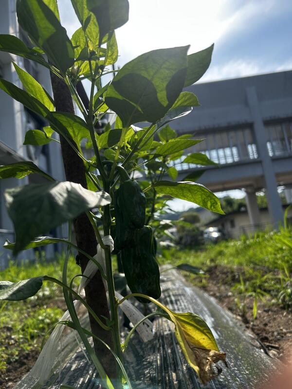 6月8日に九州北部が梅雨入りしました。御船高校も、雨の月曜日です。校内の菜園では、植え付けから1カ月が経った野菜たちがぐんぐん成長しています。野菜の花をじっくり見たことがありますか?ナス、ピーマン、きゅうりの花は、形も色も可愛いです。ぜひ観察してみてください。