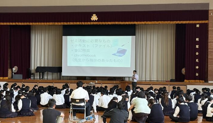 新・総合的な探究の時間が本日より始まりました。なんと、1~3学年生徒と教師全員で行います。全学年全教師の取り組みは全国でも珍しいです。今日は体育館でオリエンテーションがありました。探究の時間の目的や年間の流れについての確認がありました。みなさん、頑張りましょう!