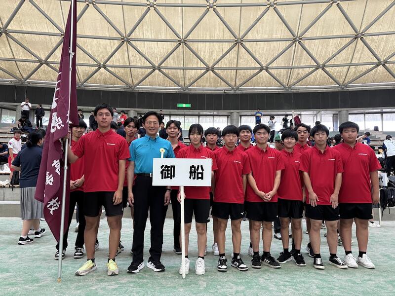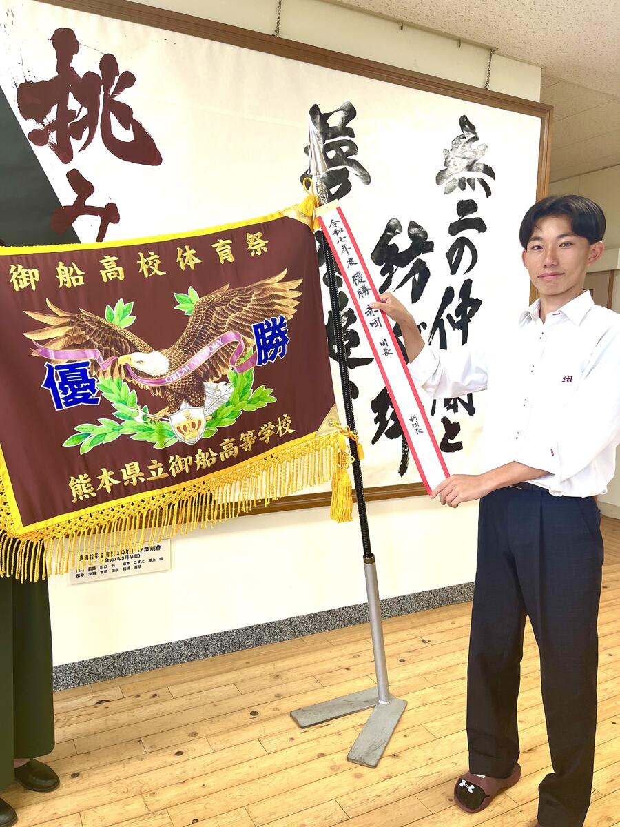 体育祭の優勝旗を本校卒業生の方から寄贈していただきました。今年度優勝した赤団に使わせていただきました。新品の優勝旗は布に刺繍で文字や模様が縫ってあり、持つとずっしりとした重みのある豪華な雰囲気です。今後の体育祭に品格や格式を感じることができる良い品を寄贈していただき、御船高校の職員生徒一同、大変喜んでいます。ありがとうございます。大切に使わせていただきます!