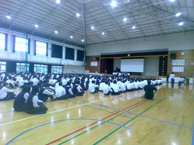 初めに体育委員長から体育祭に向けての激励の話がありました。続いて交通委員から自転車通学生のヘルメット着用などの話があり、そして最後に生徒会から体育祭と中間考査を受ける心構えなどの話がありました。