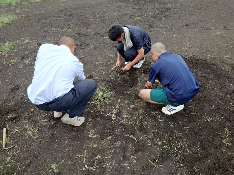 3週間前に事務長先生と生徒会で畑を耕し、植え付けを行った【御船農園】の夏野菜も朝日をたっぷり浴びてグングン成長中。