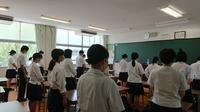 終業式は、午後1時半から全校放送形式で実施しました。生徒の皆さんはそれぞれのホームルーム(教室)で聴きます。最初に、「令和2年7月豪雨災害」によって犠牲となられた方々のご冥福を祈り、全員で黙祷を捧げました。
