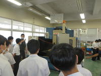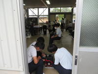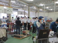 また、約80人あまりが参加してくれた電子機械科の体験入学では、6班に分かれ、電気配線、エンジン起動、旋盤・溶接、自動工作機械、電子制御(ロボット実演)等の体験コーナーをローテーションで回りました。恐らく多くの中学生にとって初めて見学、体験する施設、設備ばかりだったと思います。強い興味、関心を示す一方、不安に感じる者もいたでしょう。しかし、案内係及び実演担当の電子機械科の2、3年生が「最初はできなくても、みんなわかるように先生方が教えてくれるから大丈夫だよ」などと声をかけ、丁寧に接する姿勢が印象的でした。彼らにとって、見学する中学生は2、3年前の自分だということがわかっているのでしょう。