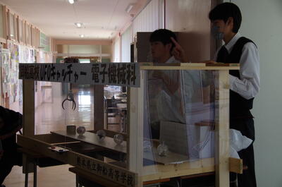 電子機械科では、先日県大会に出場したアイデアロボットとマイコンカー、それにクレーンゲームを使った展示を行いました。