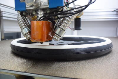 上の写真は3Dプリンタでハンドルを製作している所です。