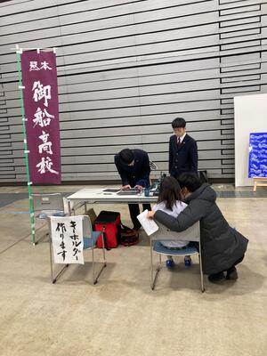 御船高校電子機械科からは電気自動車「わたあめ号」を展示・試乗体験とレーザー加工機による木製キーホルダー制作を行いました。生徒諸君は接客から製作までよく頑張りました。お客様が多すぎてほとんど写真が撮れていません。開始直後で撮った一枚を掲載します。自称「日本一面白い電子機械科」の御船高校をよろしくお願いします。