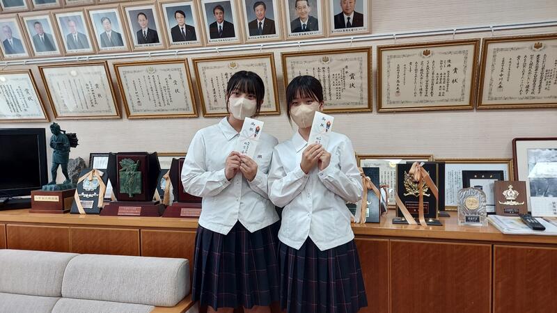 少林寺拳法競技で全国高校総体(北海道)へ出場する普通科2年・緒方さん(左)と、書道で全国高校総文祭(鹿児島)へ出場する芸術コース3年・福田さん(右)の奨励金授与式が、校長室で行われました。