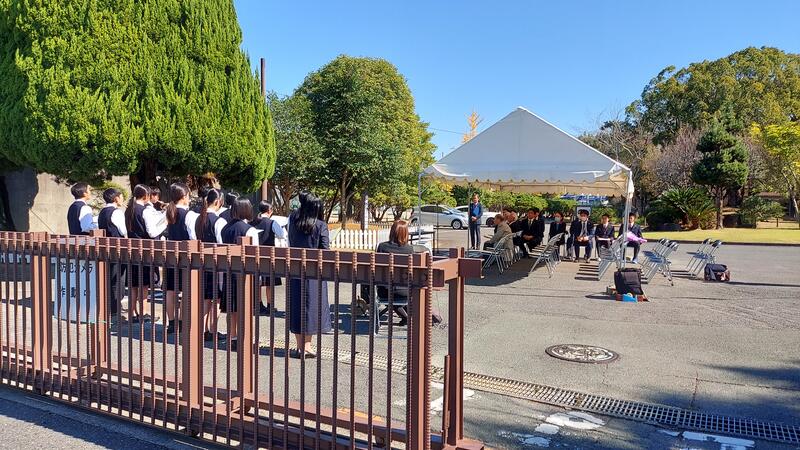 また、本校正門近くの殉難の碑前で慰霊祭が行われました。音楽専攻生のオープニングセレモニーに始まり、厳かな式が執り行われました。