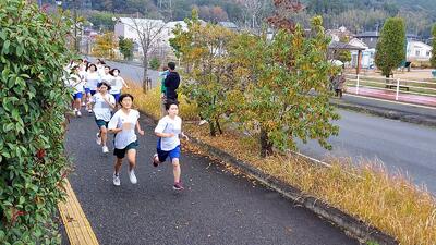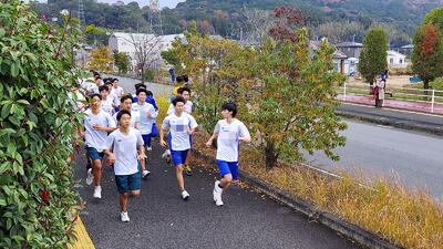 小雨の中、長距離走大会がスタートしました。男女ともに無事出発。頑張れ船高生!