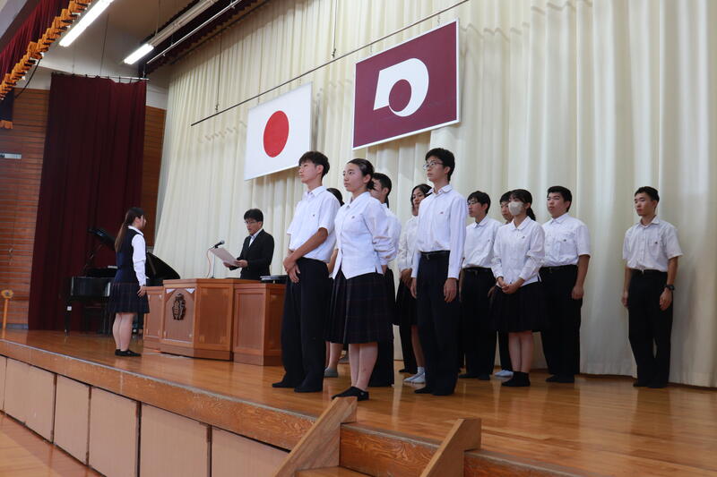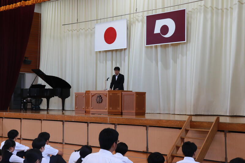 校長先生から、ご先祖様の人数についてのお話と脈々と途切れることなく続く生命のバトンの受け渡しがあって初めて我々はこの世に生命を授かっていることについて意識して「いのちの大切さ」を実感してほしい、とのお話がありました。また、詩人である茨木のり子さんによる「自分の感受性くらい 自分で守れ ばかものよ」詩の紹介があり、「人間としての土台を」つくるような行動をしてほしい、とのお話がありました。また、始業式前には、表彰式が行われ1学期に活躍した御船の生徒たちの紹介がありました。
