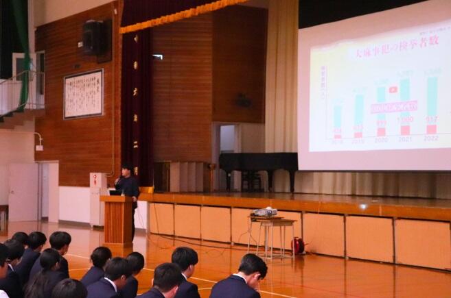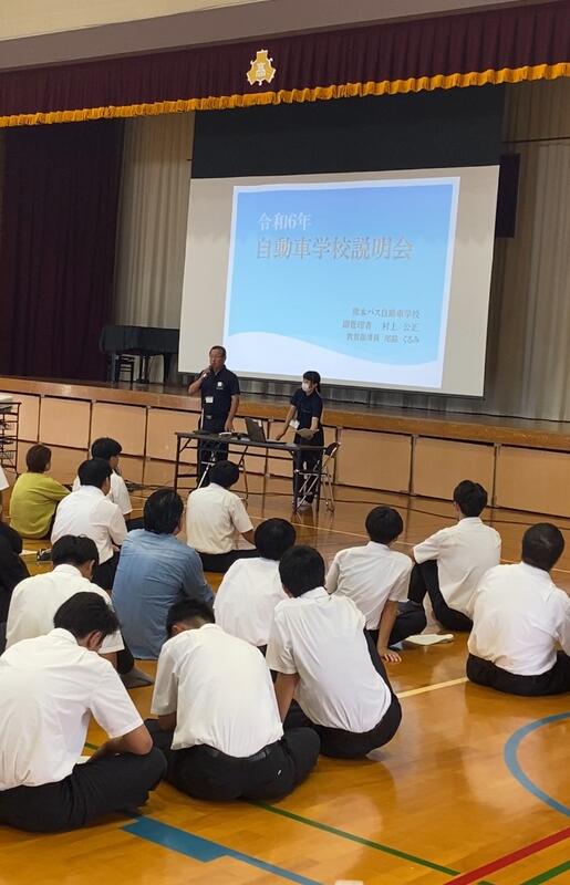 令和6年9月27日(金)午後、3年生の生徒、保護者対象に、本校体育館にて自動車学校入校についての説明会を実施しました。生徒指導部の先生方、自動車学校の入校や免許取得に関する学校のルールを説明したあと、熊本バス自動車学校の方々をお招きして、お話をしていただきました。