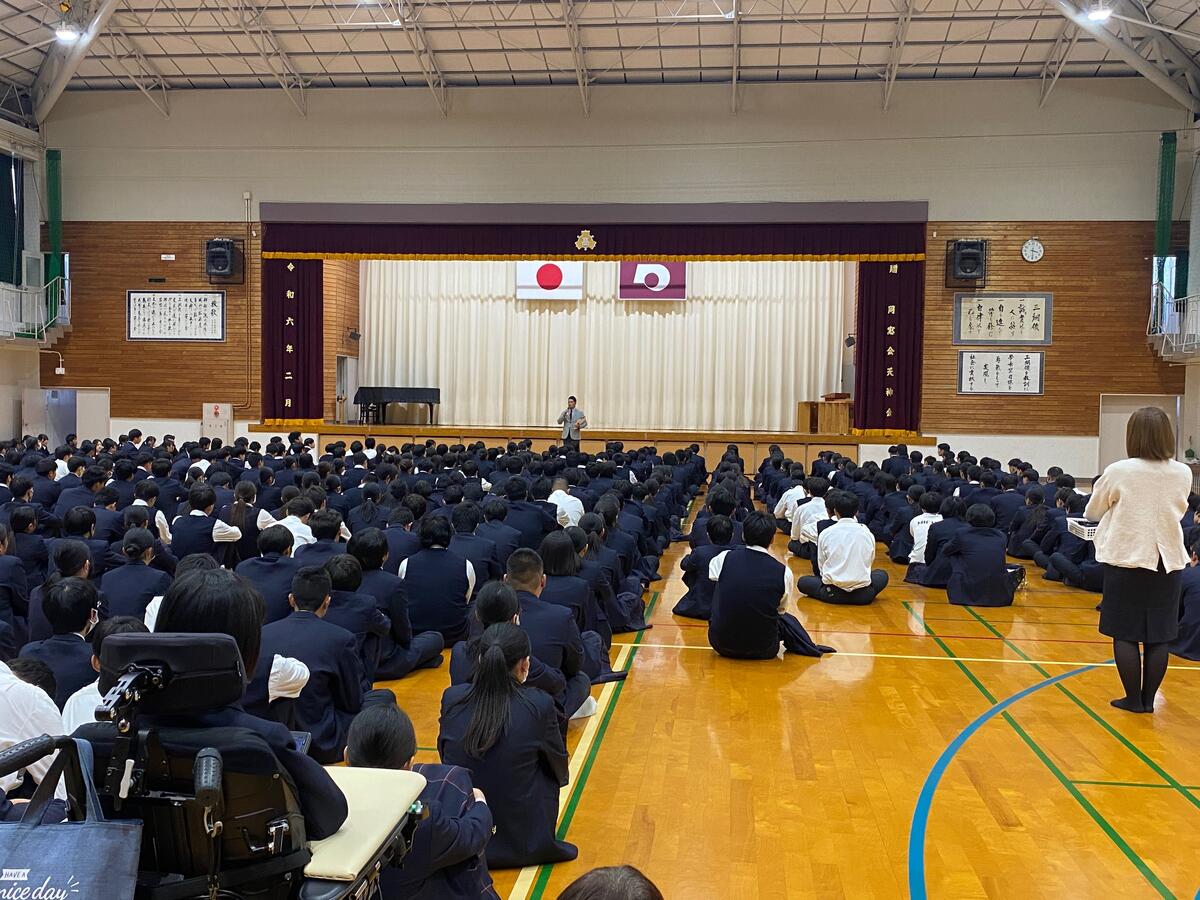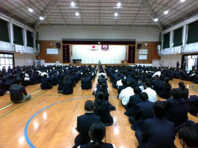 令和7年1月28日(火)学年末考査終了後、体育館にて3学年の学年集会がありました。家庭学習期間における生活の注意等のお話がありました。学年主任の河田先生から「夢を持つことの大切さ」について、先生自身の体験を交えたお話がありました。集会後、卒業式に向けて「仰げば尊し」と校歌の練習がありました。