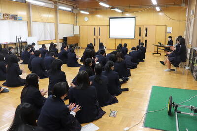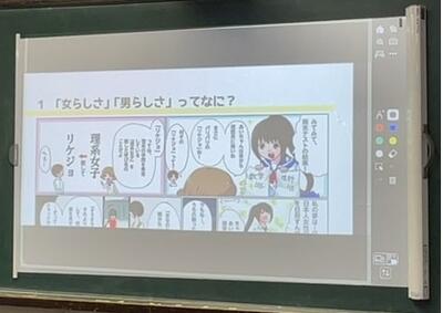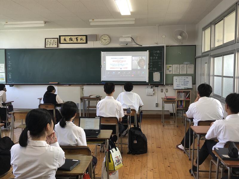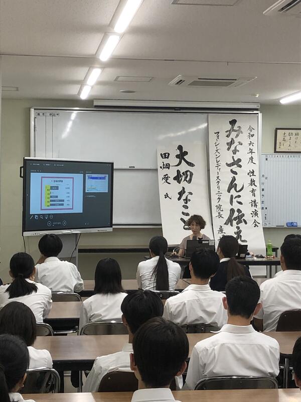 7月3日(水)、フォーシーズンレディースクリニック院長で産婦人科医師の田畑愛氏を講師としてお招きし、性教育講演会を開催しました。熱中症予防のため、会場を体育館から会議室と各教室に変更し、ハイブリッドでの開催となりました。冷房が効いた快適な環境の中、ジェンダーギャップや恋愛と妊娠・性感染症・子宮頸がんについて、資料や実体験に基づく田畑先生のお話をお聞きし、思春期に必要な性の知識と適切な行動選択力を身につけることができました。