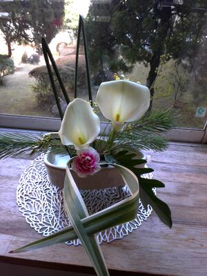 本日の花材は、ガーベラ、シマフトイ、ソリダコ、ナデシコカーネーション、モンステラです。