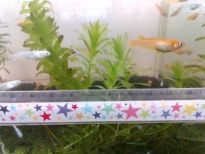 生物部のメダカが、大きいものは3cmくらいに成長し、