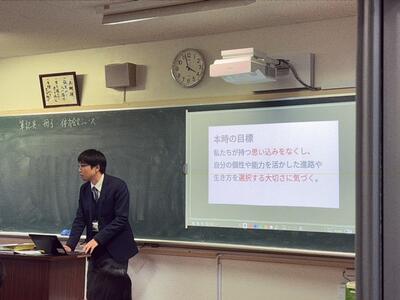 令和6年1月19日(金)6限目、総合的な探究の時間の課題研究発表会を行いました。クラス代表の発表者6名がそれぞれ調べたテーマについて、スライドを使って発表しました。生徒たちは発表を聞いて、興味深かったことや新しく知ることができたことなどを感想記入用紙に記入しました。