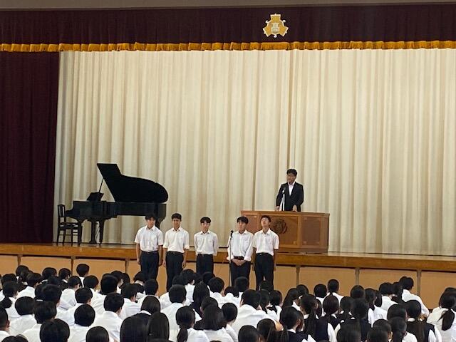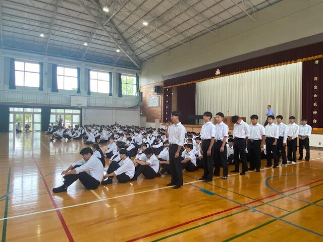 令和6年7月2日(火)本日は8:30から体育館にて全校朝礼がありました。新生徒会長・副会長からの挨拶のあと、夏の全国高等学校野球選手権熊本大会に出場する野球部の推戴式を行いました。御船高校は、矢部・甲佐・湧心館・松橋・八代農業との合同チームで出場します。頑張ってください。