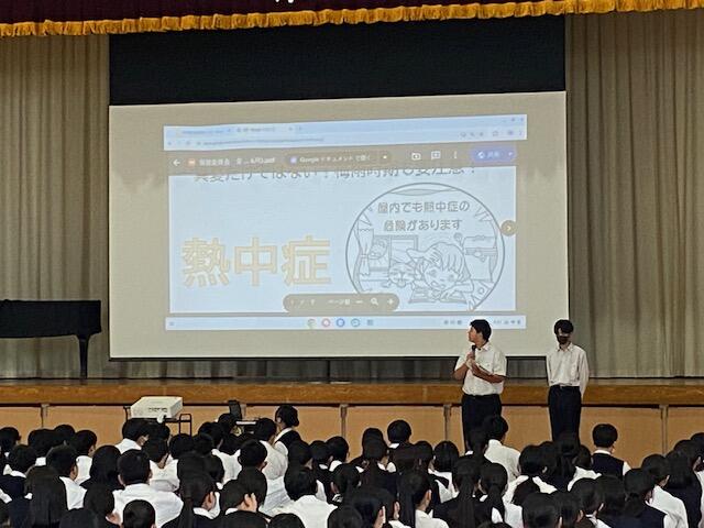 保健委員会からは熱中症対策の話がありました。熱中症に対する一番効果的な対策は水分補給だそうです。こめまな水分補給を心がけましょう。