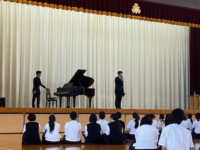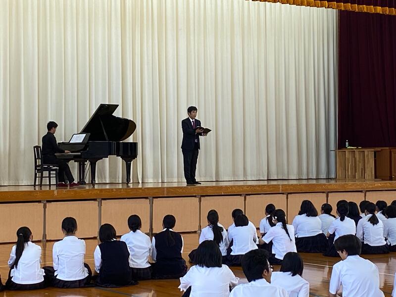 6月12日(水)お昼休み、体育館にて音楽の教育実習生の先生によるミニコンサートが開催されました。お昼のゆったりとした時間の心地よい歌声に、生徒たちは魅了されていました。福田先生ありがとうございました。
