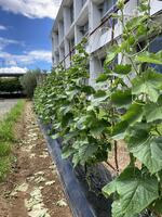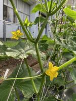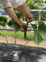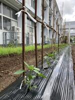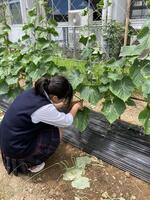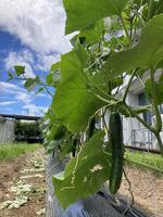 家庭クラブ委員会では、事務長先生の強力なサポートのもとで、今年度も畑づくりをしています。6月14日にナス・きゅうり・ピーマン・おくら・ししとうの苗を植えました。掃除時間に草取りをしたり、お世話を続けていますが、7月10日に初の収穫を行いました。苗を植えてから約1カ月で20cmほどの立派なきゅうりが収穫できました。とれたてのきゅうりは、みずみずしくて甘くてとても美味しかったです。他の野菜も毎日みるみる大きくなっていて、観察するのが楽しみです。