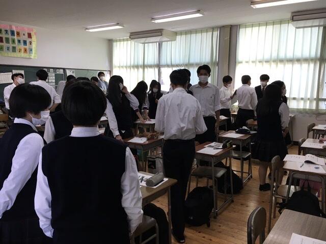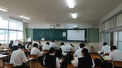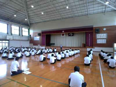 2学年では、2学期に計画されているインターンシップについての話や、新学期に向けての服装頭髪点検が行われました。