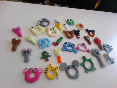 授業では赤ちゃんのガラガラを制作しています。フェルト布地を使いオリジナルの形を考え、中に鈴を入れて完成するのが楽しみです。