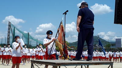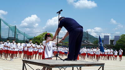 1年2組の緒方今日可さんが優勝しましたので同窓会より奨励金の贈呈がありました。