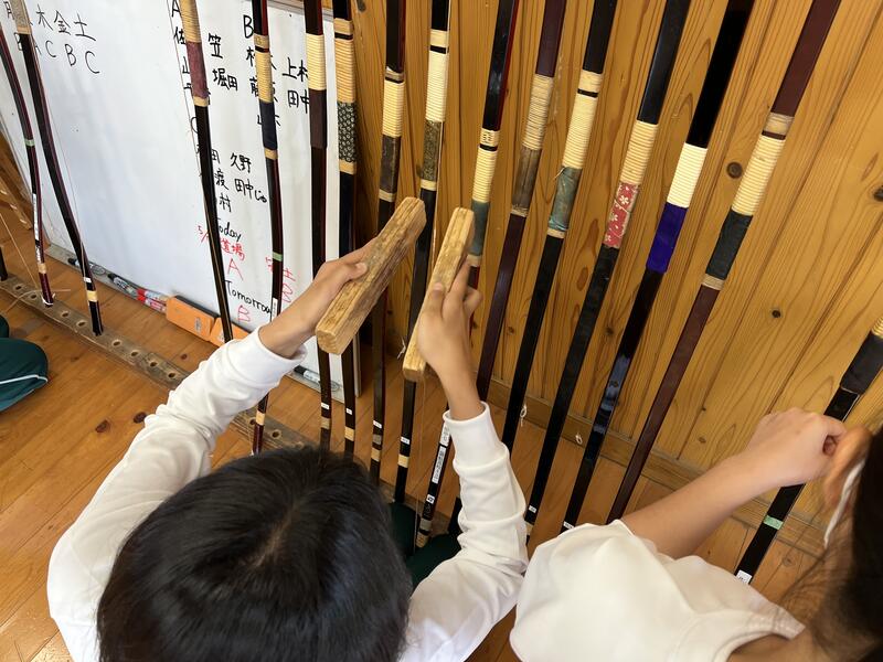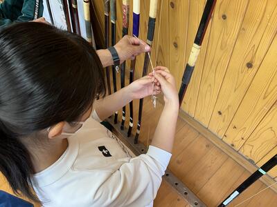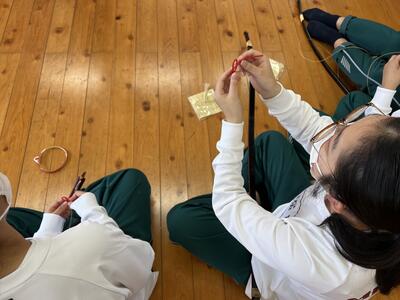 弓道部です。今日は1年生が替え弦作りに挑戦しました。