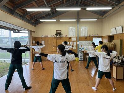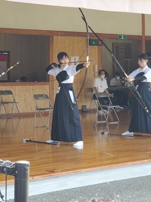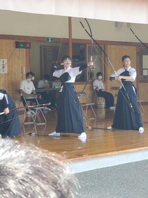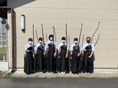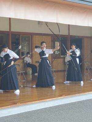 弓道部です。総体で試合デビューした1年生ですが、弓から離れてもう一度基礎から学び直しです。