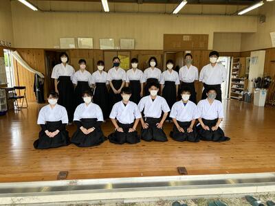 弓道部です。今年の1年生は入部時から6月の総体出場を目指して、練習をしてきました。今日は袴の着付けを先輩から教わり着てみました。