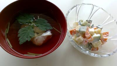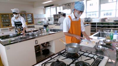 3年生のフードデザインの授業では、7月に受検する食物調理技術検定に向けて、指定献立の練習をしています。今回の3級の指定献立は、「吉野鶏の吸い物」と「マセドアンサラダ」です。今日は5回目の実習でした。みんな毎回上達しています。