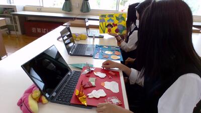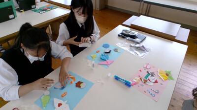 3年生の「子どもの発達と保育」の授業では、折り紙を使った造形展示物の制作をしています。折り紙の折り方を各自で調べて折り、画用紙に配置しています。