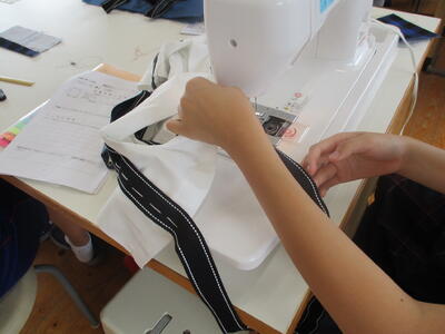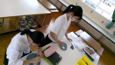 今日は御船中学校から職場体験学習に来ました。体験授業では芸術コースの1年生のクラスに入らせていただき、裁縫の授業を体験しました。実際に裁縫をし、ティッシュケースを作成しました。高校生のみなさんはトートバッグを作成中で協力しながら楽しそうに作業されているところがとても印象的でした。(御船中2年M,O)