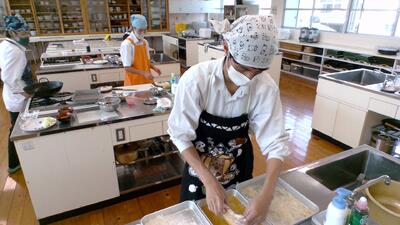 3年生「フードデザイン」の授業では、今週も食物調理技術検定の練習をしています。今日は、指定調理の2品に加えて、鶏肉のくわ焼きも作りました。