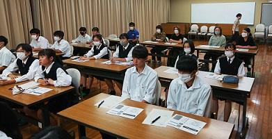 7月26日(金)、本日は中学生体験入学を開催し、県内28の中学校から、中学生220人、保護者57人と多くの方に参加していただきました。開会行事では吹奏楽部の歓迎演奏や書道部の書道パフォーマンスが行われ、生徒会長の歓迎挨拶やスライドを使った学校紹介がありました。